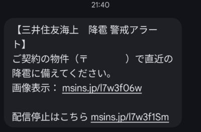 どうやら、ワタシが契約している自動車保険では契約住所を元に雹災緊急アラートというのを発出してくれるサービスがあったらしい。長年契約していましたが、初めて受け取りまして若干焦りました。一応過去にもココから別件で SMS 受け取っていたので、迷惑系 SMS ではないというのはすぐに判断できました。