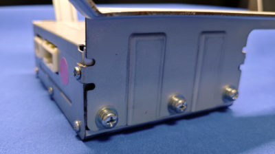 トランクルームの上部に取り付けられていますが、この部品の状態のようにステーごと車体から外すのは結構面倒。リアシート外して、リアガラス下の内張外して上側からネジを外さないといけない。なので、交換するならステーを車体に残した状態で、BOX だけ取り出そうと考えていました。この右側の3本のネジと、前側のネジはアクセスしやすいですが、裏側にある小さなネジは若干アクセスが悪い。長さの短いドライバー使えば外せそう。