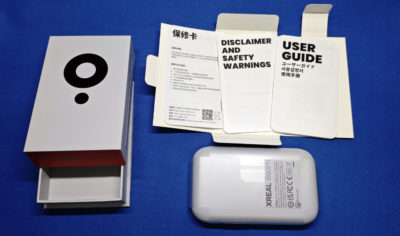 付属品は冊子が3冊のみ。この XREAL Beam はバッテリー(4870mAh)搭載で、ナカミは Android 11 をベースにしたカスタム OS で、XREAL 系の XR グラスを接続するだけで動画の視聴とかができるデバイス。また、Air Pay や Google の Cast の受け手になって、ワイヤレスで様々なデバイスからの映像を受信するレシーバーにもなります。このため、DP Alt Mode 非対応なスマホ等からでも映像投影ができるというデバイスです。配信済のアップデートによって、Amazon Prime Video と Netflix アプリが提供されて、Beam 単体でこれらの動画視聴が可能になったらしい。また、Files と VNC も使えるらしく、手元の動画ファイル再生も単体でできるらしい。ワタシの用途だと、動画ファイルの視聴がメインなので、コレがあればスマホ不要で視聴できそうなのが魅力。