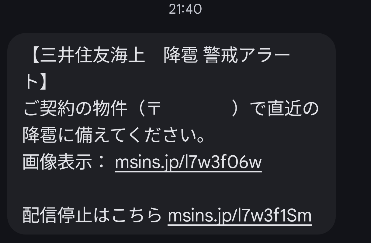 どうやら、ワタシが契約している自動車保険では契約住所を元に雹災緊急アラートというのを発出してくれるサービスがあったらしい。長年契約していましたが、初めて受け取りまして若干焦りました。一応過去にもココから別件で SMS 受け取っていたので、迷惑系 SMS ではないというのはすぐに判断できました。