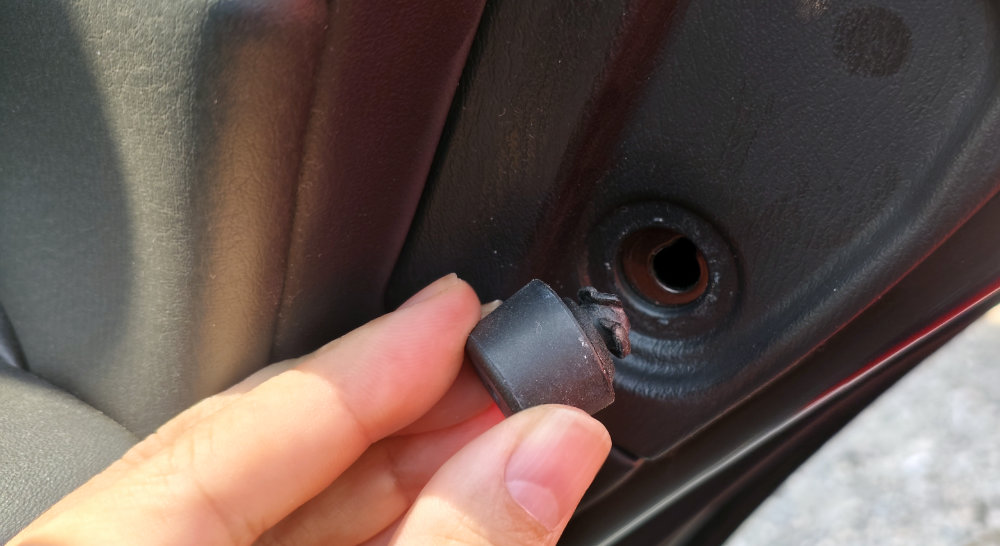 続いてはドアのエッジ部分にある衝撃吸収ゴムを外します。コレは反時計回りに回しながら引き抜く感じ。ゴムの一部に斜めの切れ込みがあり、コレがドアの鉄板に空いた穴の凹んだ部分に嚙み合うと外せる感じです。