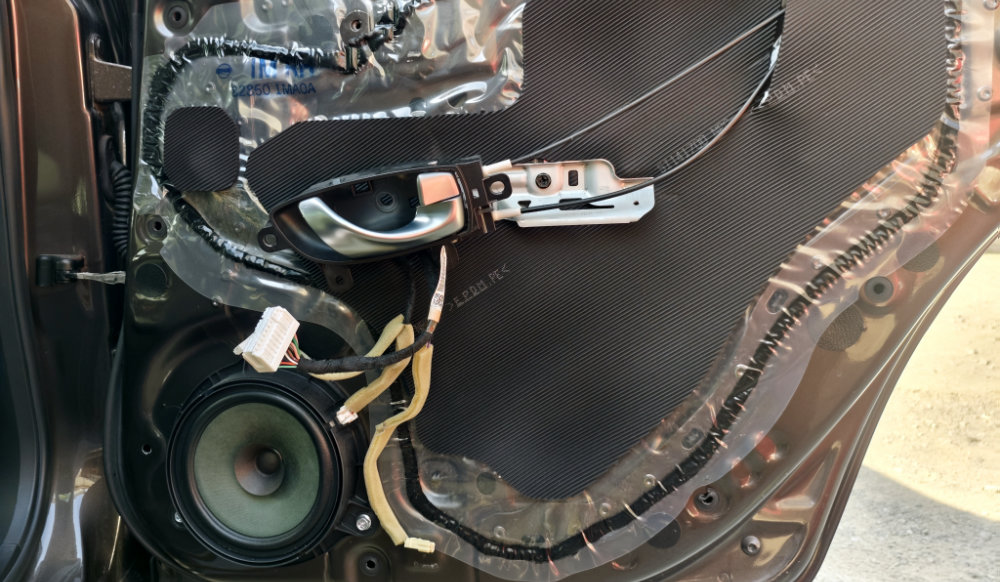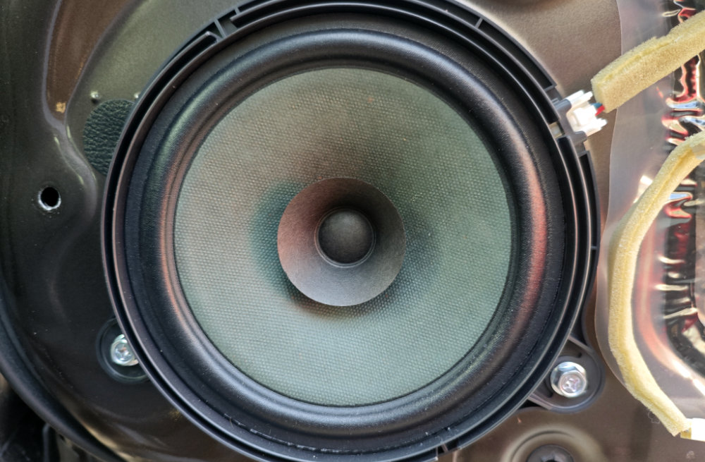 原因は・・・右リアのスピーカー(運転席側の後部座席ドアに埋め込まれている)からノイズが出ていました。エンジン負荷に連動しているのは、ANC (アクティブノイズキャンセラー)で本来打ち消すために出している室内ノイズの逆位相波形が、変な音になってノイズとなっているというコトでした。