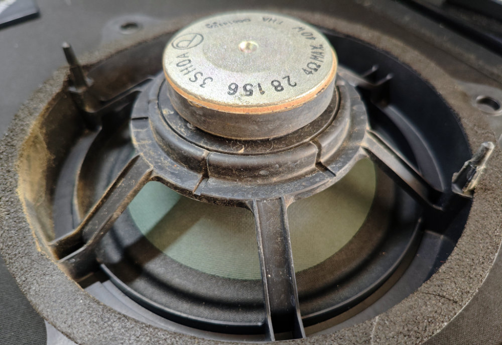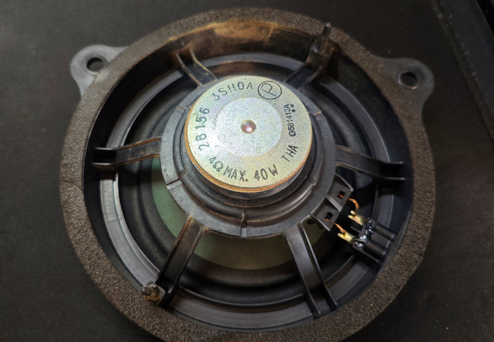 取り出したスピーカーを家に持ち帰って、別のアンプに接続(TV に繋いでいるスピーカーの代わりとしてみた)。すると・・・車内で鳴っていたのと同様の音割れ状態でした。つまり、異音の原因はこのスピーカーであると特定できたました。
