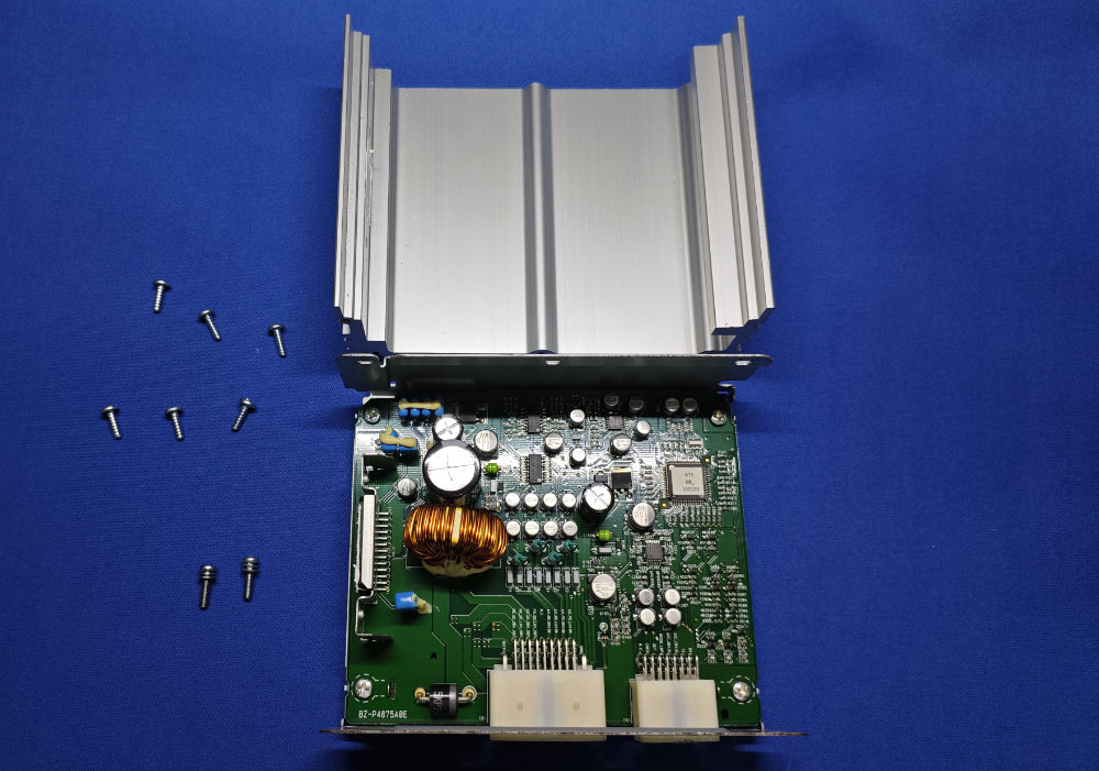 BOX のフタはアルミのヒートシンクになっていまして、コレも8か所のネジ留めを外せば・・・ナカミの基盤とご対面。フタのヒートシンクと基盤から出たアンプIC(発熱部分)との接合部には放熱グリスが塗ってあるので、分解後は触れると手に付くので注意が必要です。