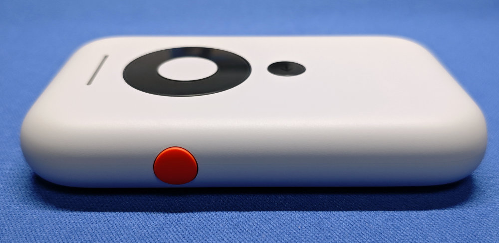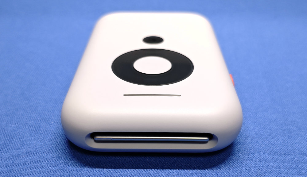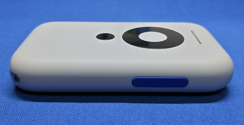 右側エッジの青いボタンはボリュームボタン。本体表面は棒状の LED インジケーターと、丸い部分は中央が OK ボタン、周囲が4方向の方向ボタン、下側の黒丸が戻るボタンという感じ。