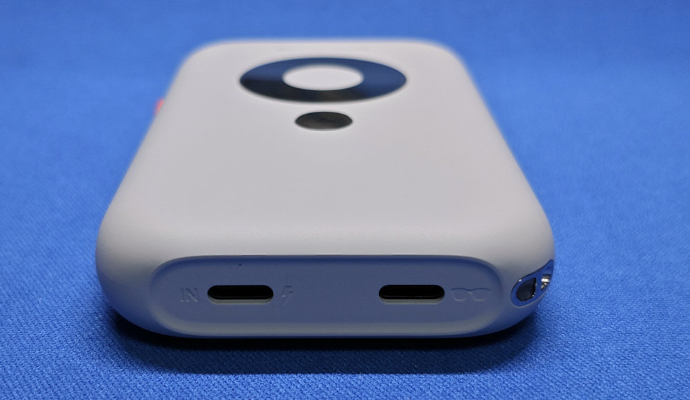 下側エッジには Type-C のコネクタが2つ。左側は充電ポートと映像入力。ココに HDMI to Type-C とかのアダプタかまして有線での映像入力も可能。右側は XR グラスを接続するポート。普段はこの左側とグラスを接続するだけで映像視聴 OK という感じですかね。ストラップホールもついています。単体で視聴する場合は、左側の Type-C ポートを使って充電しながらも使えるそうなので、長時間の利用もできるっぽい。