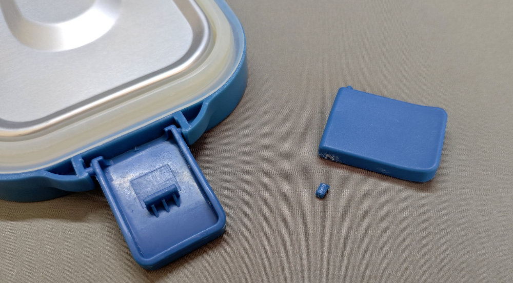 使用後に洗浄して片付けようと、フタを閉めようとしたところ・・・フタを本体に固定するためのフックが取れました。よく見たら、回転軸がポッキリと折れてしまっています。