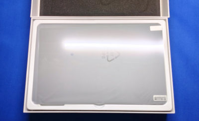 早速 BOX オープンです。本体の上に予備のスクリーン保護フィルムが入っていました。既に張り付けてあるヤツと合わせて2枚あるようですが・・・ベッドサイド以外での利用は考えていないので、保護フィルムは正直無くても良かったですな。