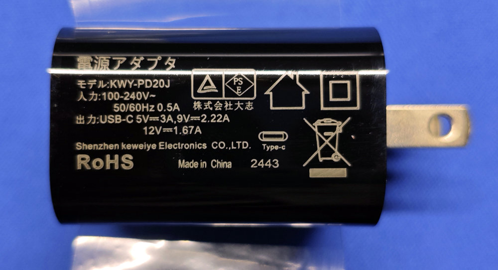 付属の電源アダプタは 20W の PD 対応っぽい。タブレット本体の裏側には Input 5V/2A , 9V/2A と記載があるので、12V の出力はオマケかも。まぁ・・・コレは使わず箱の中ですな(笑)。