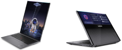 変形するのはもう1種類ありました。ThinkPad Rollable XD Concept は縦方向に伸びます(笑)。画面の上側エッジを折り目にしてパネルの裏側に格納していたフレキシブル OLED が、伸びると全て全面にやってくるという仕組みらしい。格納した状態だと、天板の部分のほとんどが表示エリアになってしまうので、持ち運び時等の耐久性が心配なのと、縦方向に伸びると不安定になりそうなので、コレよりは横に伸びる LEGION の方が筋が良さそう。