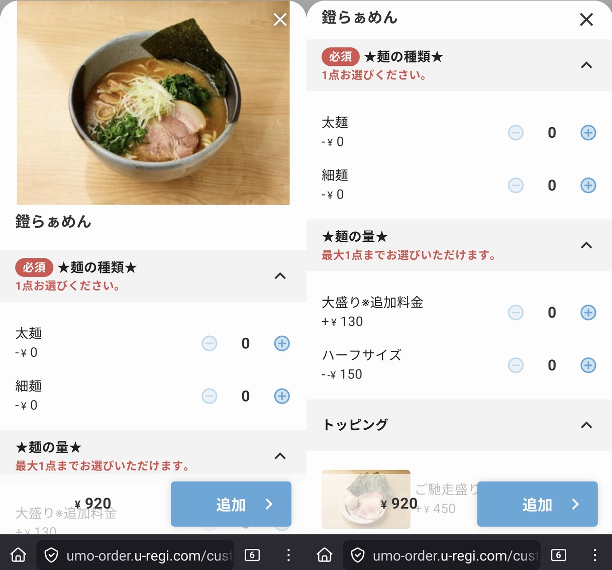注文は QR 読んで各自スマホでっていうスタイル。居酒屋なら便利なんですが、ラーメン屋では珍しい。注文しようとしたら、結構 UI が使いにくくて困りました。ラーメン1杯オーダーするのに、麺の種類、量、トッピング、〇〇抜きなど、選択肢が多すぎ(笑)。確かにコレは口頭で注文すると間違えそうなのですが・・・スマホ苦手な人でもそうでない人でも迷いそう。そして、カートに追加して最後に発注する際にはコンファーム画面無しでいきなり注文完了となる点。これだけ複雑なオーダーしておきつつ確認無しって・・・危険な UI です。