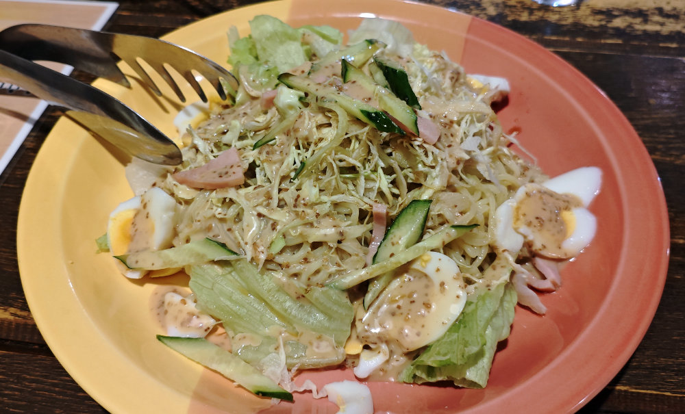 T氏もワタシもなぜか昼飯逃してしまって腹ペコだったので・・・ラーメンサラダ。