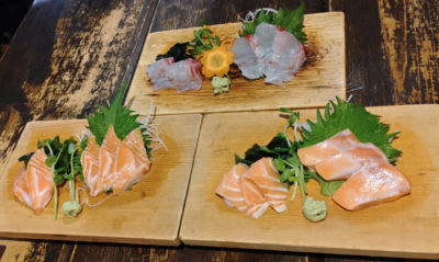 そろそろ日本酒タイムということで・・・お魚をズラリと並べてみました。へ鯛、生トロサーモン、生サーモン。サーモンは食べ比べしてみようと頼んでみたけど・・・どちらも脂乗りがすごくて食べただけでは差がワカリマセンでした。