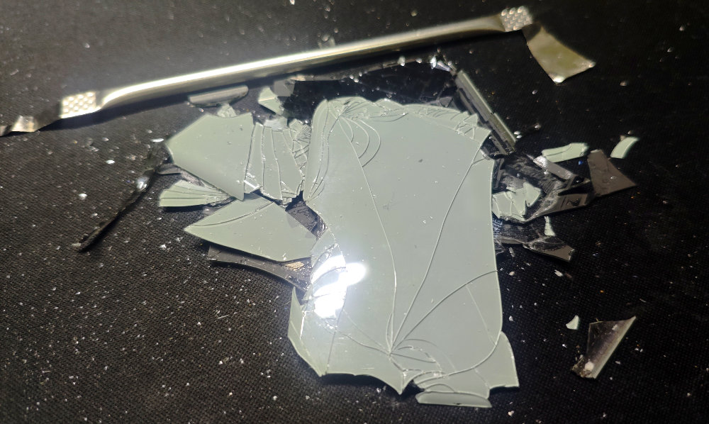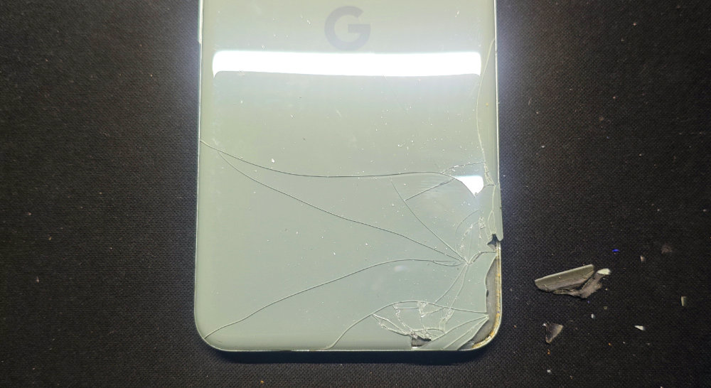 交換のためには、接着されている背面パネルを外す必要があります。ヒートガンで周囲を加熱して粘着力を弱めつつ、スパジャーを差し込んでみたら・・・既にひび割れて破損していたコトもあって、ガラスが細かく砕けてしまいました。こうなったら、砕きながら気長に剝がしていくしかなさそうです。