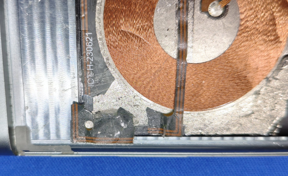背面パネルは除去できましたが・・・無線充電のコイルと NFC アンテナのモジュールがダメージを受けました。背面パネルはフレームの外周に沿って接着されているんですが、この無線アンテナユニットも全体的に背面パネルに接着されていました。コレがなかなかうまく剥がれなかったのです。かなり慎重に加熱してスパジャーを入れていったのですが・・・背面パネルのガラスが「パキッ」と割れたタイミングで、NFC アンテナも切れてしまいました。なんとか一部だけで・・・と粘ったのですが・・・