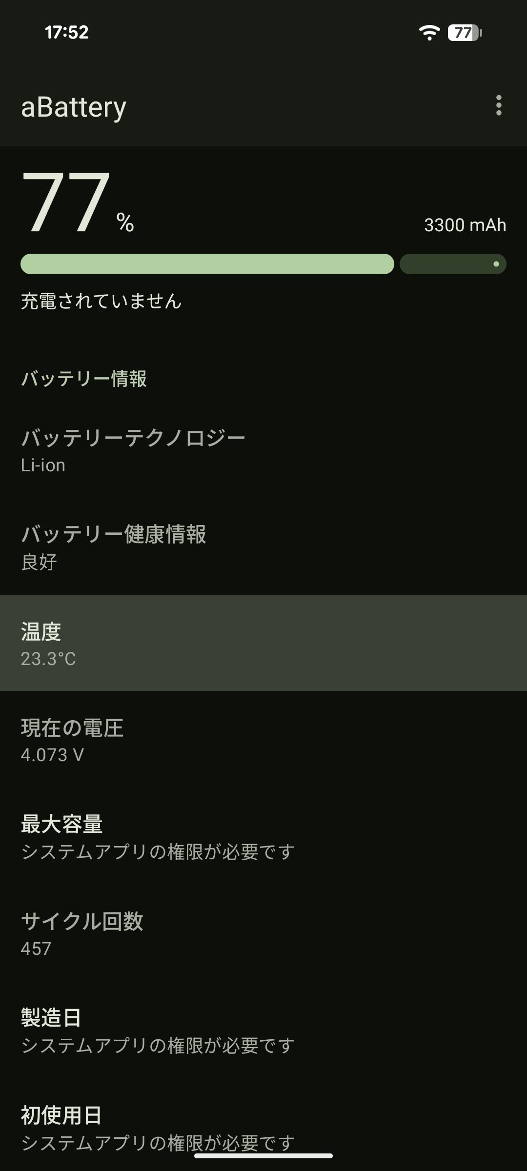 Pixel 8 はそのままではバッテリーのサイクルカウントが表示されないので、aBattery というアプリを入れて確認したところ・・・457回となかなか使い込まれた端末であることが判明。将来バッテリー交換するといった事があれば、ついでにアンテナモジュールも交換してみてもイイかな。時間が経てば、他の古い Pixel 同様にアンテナモジュールの価格も下がってくるかもしれません。
