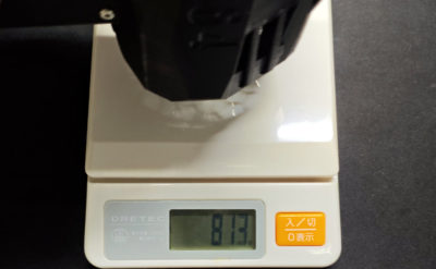 どれだけ強風かは・・・X9 でも測定した重量計での測定。109g だった X9 のほぼ8倍となる 813g を記録(爆)。実は結構測定値は安定しない程に風が出ます。コンスタントに800以上は出てました。