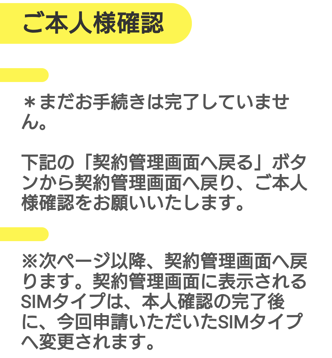 マイナンバーカードの撮影と、本人顔写真の撮影を行うと、またしても元の契約管理画面に戻ります。コレで確認待ちなのかな・・・と思って待っていたのですが、一向に進まない。撮影処理する前と同じような「本人確認をする」という案内が出たまま。何か失敗したのかな? と思い、翌日に今一度「本人確認をする」を押したら、写真撮影とは別な名前や電話番号を確認するページに遷移。なるほど・・・本人確認は2段階あったのですな。契約管理画面では1段階目と2段階目がほぼ同じ(に見えた)ので、勘違いしていました(というか、とってもわかりにくい)。