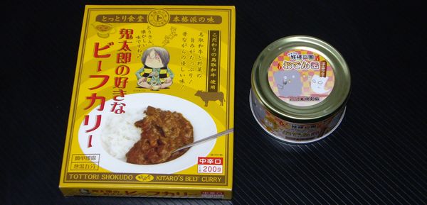 おみやげに「ゲゲゲの妖怪楽園おでん缶」と「鬼太郎の好きなビーフカリー」なるものをいただきました。どちらもまだ怖くて(?)食していないのですが、どちらも保存がききそうなのでエマージェンシーな際に(いつだよ・・・)いただきたいと思います。