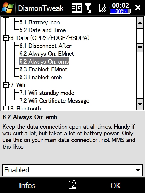 Diamond Tweak の中の 6.Data にある、6.2 Always On: emb の設定を Enabled にすることで、全ての通信を常時 emb にしてくれるようです。これで、データ通信が始まると強制的に emb 接続をしようとしてくれるようになり、リモートデスクトップモバイルも一発接続でき、途中で切断もされなくなりました。
