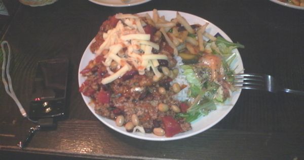 つまみにフライドポテトとオニオンリングを頼んだ後はメインディッシュなチリハンバーグ。スパイシーなビーンズとソースで飽きが来ない巨大なハンバーグがライスの上にどどーんと乗っています。