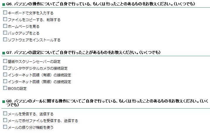 これらの質問の前に別途「パソコンの習熟度」の項目がるのですが・・・私は一番上の「かなり習熟している(ネットワークの管理やプログラムができるくらい)」を選択しましたが、そんな人に上記のような質問は愚問でしょう・・・