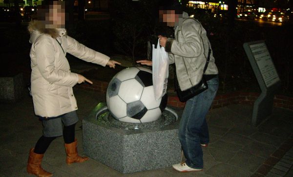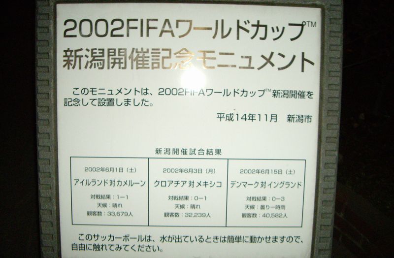 飲んだ後は駅南をふらふらと・・・ワールドカップにも使われたビッグスワンにちなんでFIFAの記念オブジェがありました。大きな石のサッカーボールが水圧で浮いてて、くるくると回すことができます。
