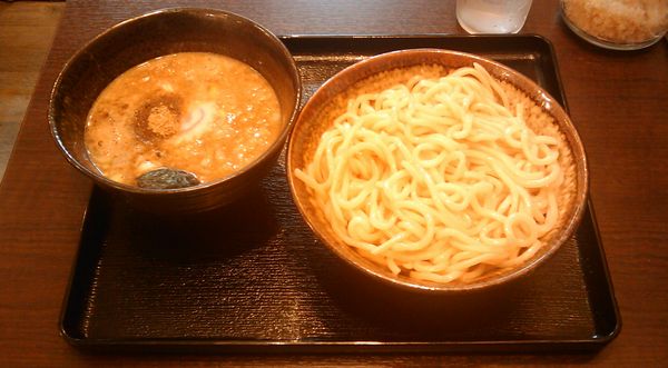 うどん?って思えるほどの極太麺。でも、火の通りが均一でなくって、芯が残っている麺が沢山混じっていました・・・スープは魚介系、というより鰹節の風味が強いですが、魚臭さは全然なくて悪くないです。角切りのチャーシューも味がしっかりついていてつけ麺に良く合います。量はちょっと大目で、結構お腹いっぱいになります。