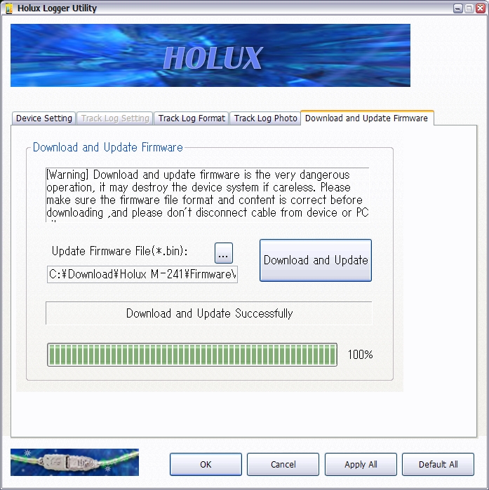 という疑問を解消すべく実験をしてみました。購入当時の m-241c のファームバージョンは 1.11 でした。そして、HOLUX のサイトには 1.12 の m-241 用のファームが転がっています。焼けば m-241c から c が取れちゃうんじゃないか。そんな淡い期待を込めて、レンガになることも恐れず、レッツトライ!!