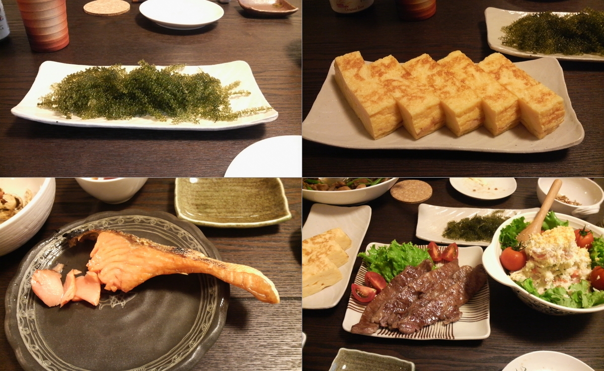 夕飯はT村家でご馳走になりました。お買い物の時にダンナが欲しがっていたので買ってみた海ブドウは沖縄産、ダンナの東京出張時のお土産なテリー伊藤のお兄さんのお店の厚焼き玉子、鮭はオツマミとしても最適♪、ご近所の極上村上牛!!、奥様謹製ポテトサラダ・・・と、オツマミな時点でお腹一杯の予感・・・