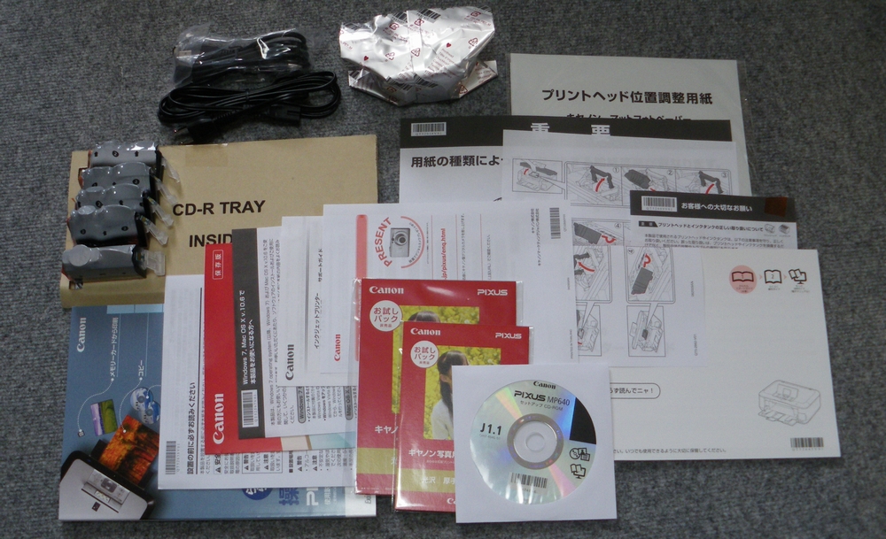 同梱品も盛りだくさん。インク5個、電源ケーブル、USBケーブル、CD-R TRAY、プリントヘッド、CDROM、お試しフォトペーパー2種類、位置調整用紙、マニュアル、その他説明書きの紙多数・・・
