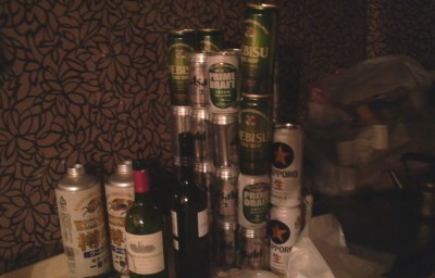 しかしたくさん飲みました・・・空き缶、空き瓶のごく一部でこの状態。ビールタワーはこの後ろにあと2列分あったりします・・・