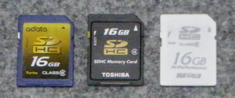 右から adata の Class 6、Toshiba の Class 4、Buffalo の Class 6 です。