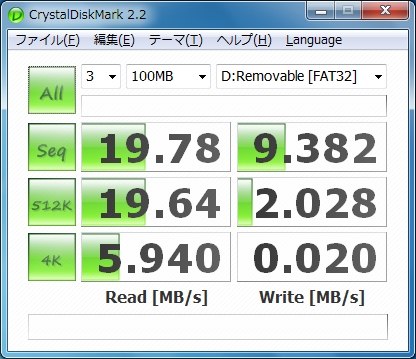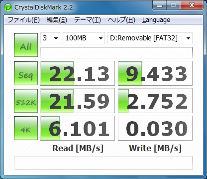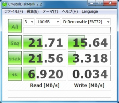 せっかくなので、CrystalDiskMark でパフォーマンスを比較しちゃいましょう。測定は Aspire One AOA150 で Windows7 から測定。