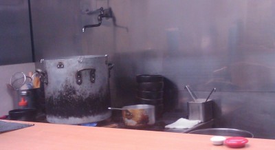 今日は厨房を撮影してみました。左側の大きな寸胴は麺を茹でるためのもの。中央の小さな手鍋がスープを温めるためのものです。注文を受けてから少量ずつスープを温めます。今まで見てきたところ、最大でも4杯分くらい。右にちょっと見える寸胴にスープが蓄えられているのですが、これを常に温めておかないところにウマサの秘訣があるに違いない・・・