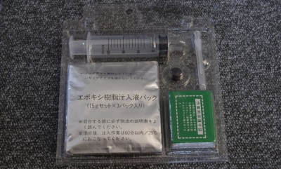 鳴る部分に2mm程の穴をあけて、特殊な接着剤を注入して、隙間を埋めるというもの。
