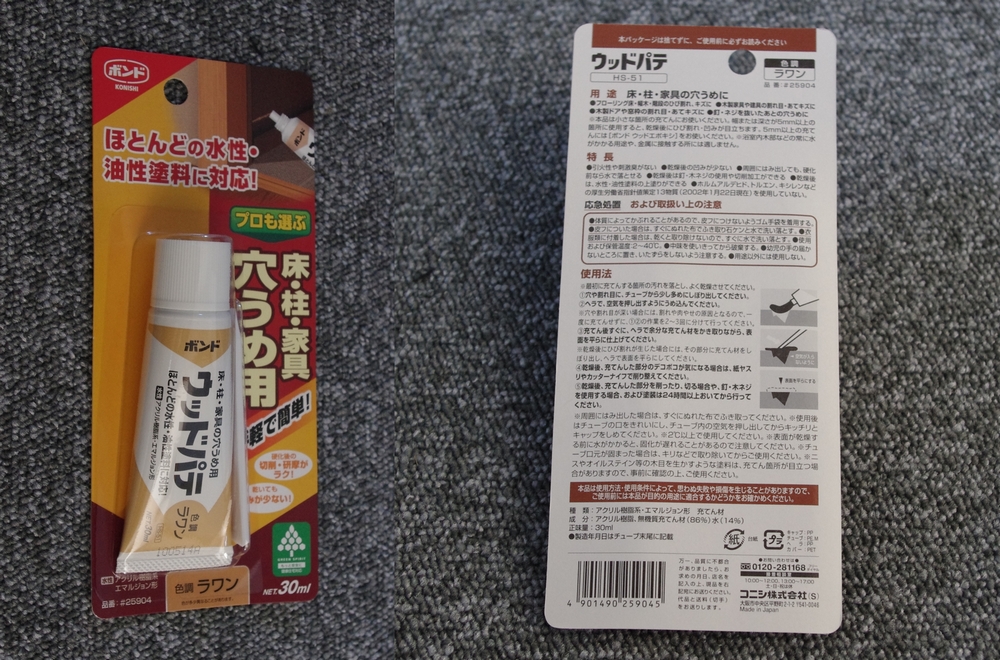 で、最後にウッドパテで目立たないように補修して完了♪ DIY ってなかなか大変ですが、楽しいですな~