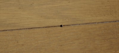 で、まずはテストってことで、端の方の目立たない場所で実験。ドリルで 2mm 程の穴を開けて、液体注入。なかなか入らなかったのですが、なんとか注入完了。