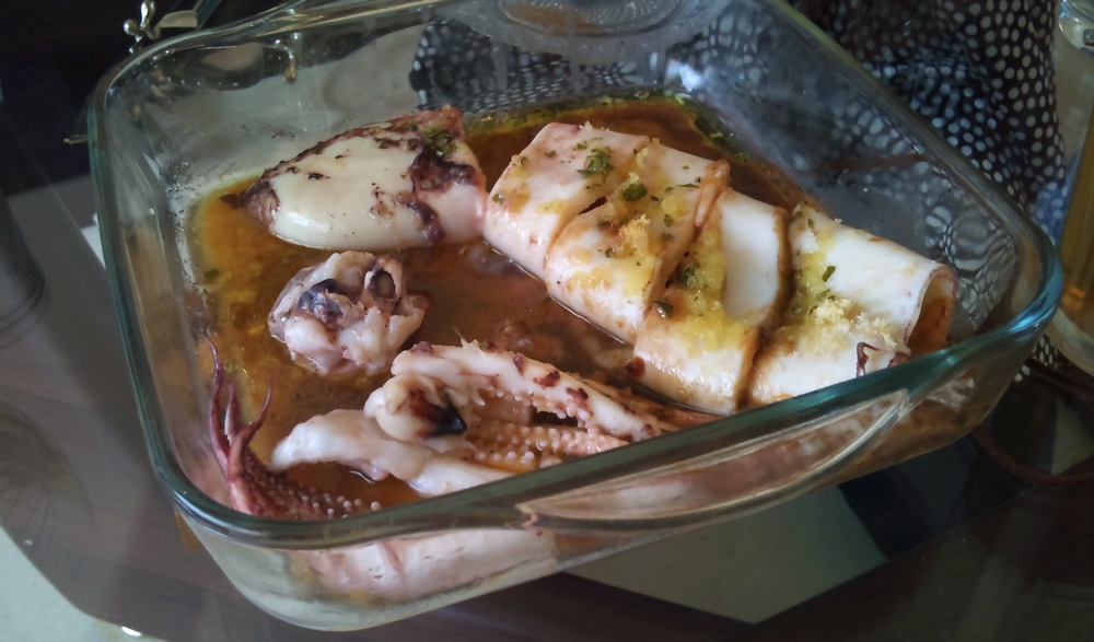 で、本日の大ヒットは、刺身でもいけちゃうほどの新鮮なイカを1本まるごとオリーブオイルに漬けてオーブンで焼いた姿焼き。イカ墨とオリーブオイルがとってもまろやかで、手作りなパンが進むのなんの・・・他のお料理もとても美味しかったです。ありがとう!!
