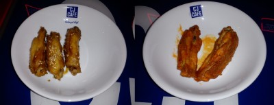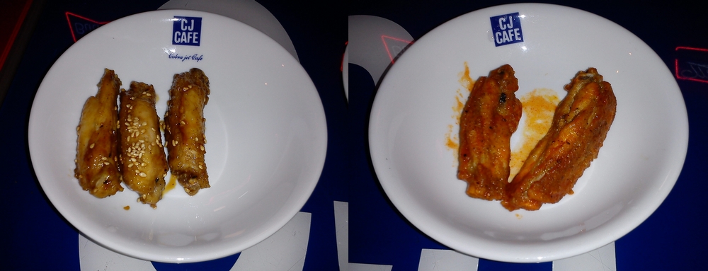 右側がそのホットソース。左側は CJ オリジナルでのテリヤキソースだそうです。ホットソースは結構辛いです。酸味がちょっと強いかなぁ~。でも、ビールのおつまみとしては秀逸です。だって、どんどん飲んでしまいそう♪ テリヤキソースは日本の手羽先にはないフレーバーになっている上、美味しい。そして中毒性も高い(食べだすと止まらない)。イケルと思います!!