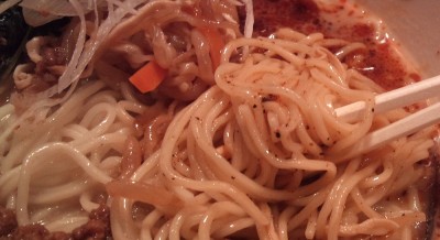 麺は随分と固め。ですが、良く冷えたスープと絡んで非常にウマイ!! 辛さ度合いはレベル2なので、そんなに辛くないです・・・いや、一般の方は辛いのかな? 途中でもう少し刺激が欲しくなって、ラー油投入しちゃいました。