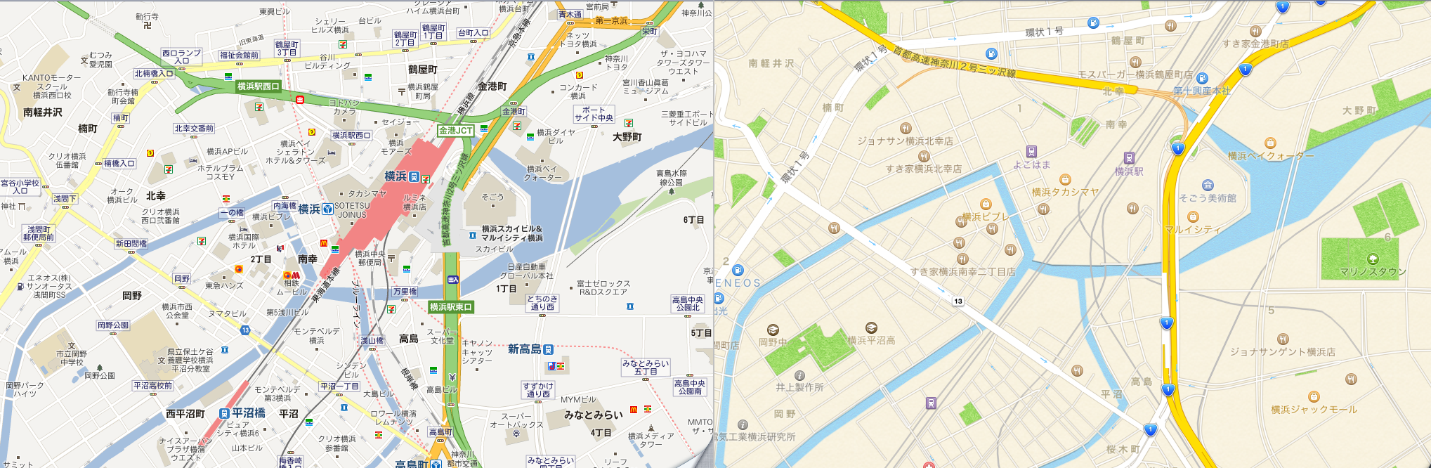 横浜駅周辺を新旧並べてみました。・・・別の時代みたい(笑)。情報量減りすぎ(爆)。