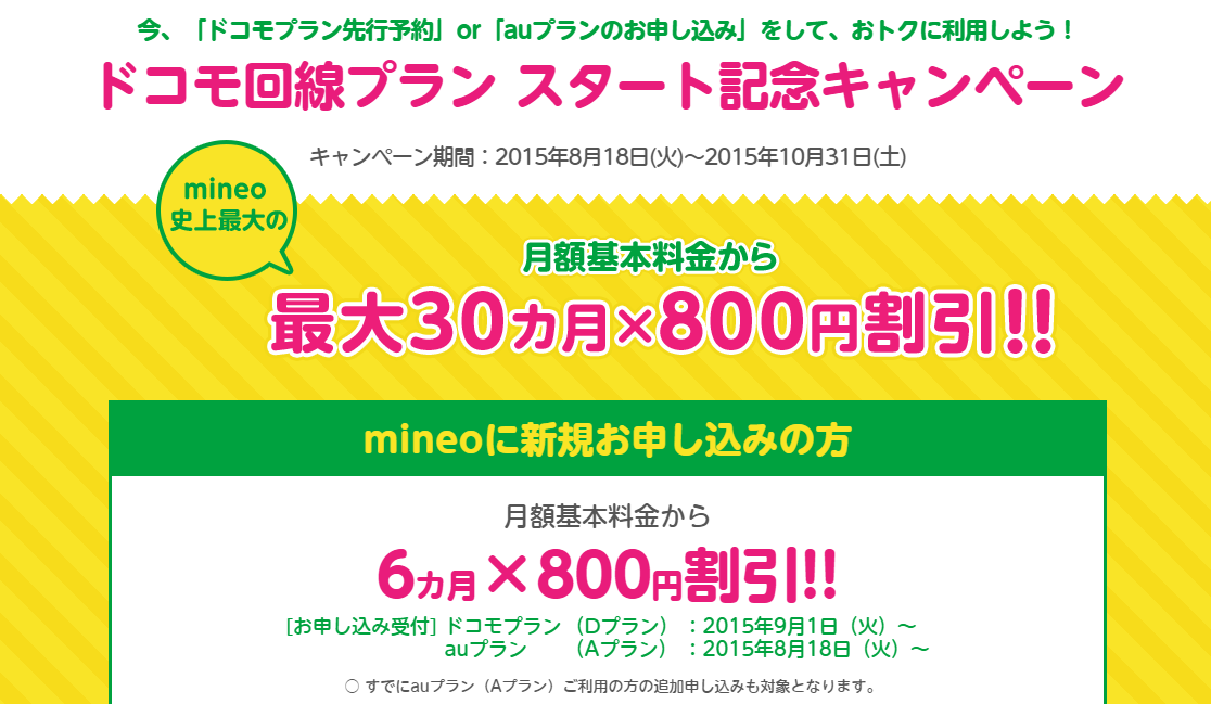 au 回線を使った MVNO でおなじみ・・・というより、iOS をバージョンアップするとデータ通信ができなくなったことで有名な mineo さんが、docomo 回線の取り扱い開始に伴う値引きキャンペーン実施中。