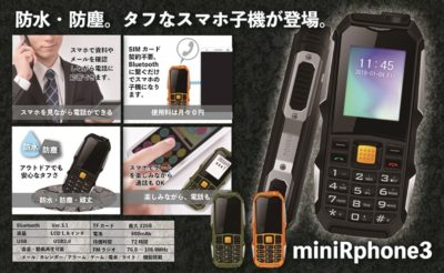 既に売り切れ状態らしいけど、mini R Phone 3 は、防水防塵対応なタフネス仕様らしい。