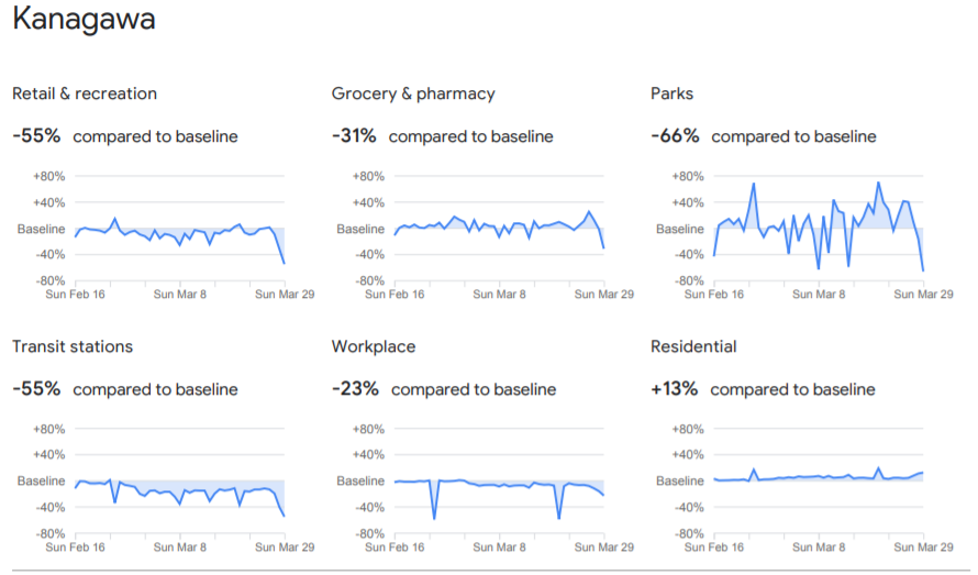 Google (日本じゃない本家の方)が、COVID-19 の影響でユーザー(全員ではなく位置情報提供に同意済のみ)の移動がどのように変化しているか、国ごとにまとめたレポートを公開しております。