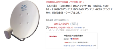 安いのでいいかな・・・ということで、DXアンテナの BC45AS というモデル。どうせ買うならということで、右旋だけでなく左旋円偏波にも対応したアンテナにしました。