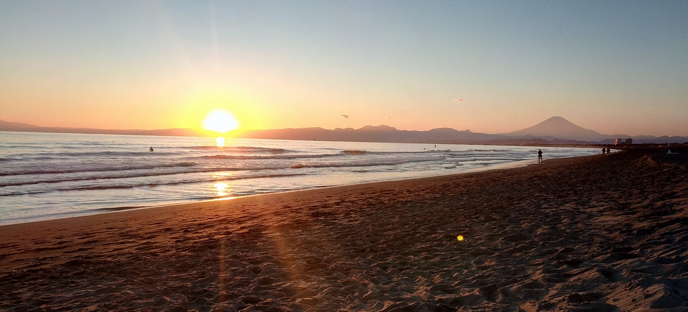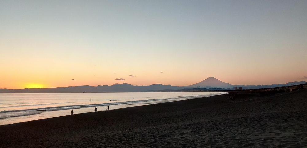 沈む夕日と富士山。それほど寒くないし、ユックリと海岸で過ごすのも良いですなぁ~。