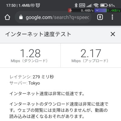 ところが VPN 経由にすると、結構ガッツリと速度が下がって 1Mbps 程度になります。まぁ、動画見たりしなければ、ほとんどの作業はそれほど困らない速度ではありますが、結構ガッツリと速度低下しますね。