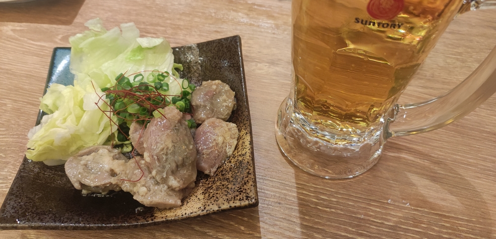 ひとまずビール1杯だけいただいて・・・後はオツマミという感じの軽食。まずは砂肝のニンニク漬け。ニンニクに漬けちゃったせいか、砂肝っぽい歯ごたえは全然ないんですな。