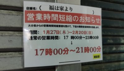 実はこの日から大分県も蔓延防止対象地区に追加され、多くの店舗が休業、もしくは短縮営業に。ホテルのフロントでも「ほとんどのお店は20時か21時までです。」とご忠告頂いたのですが・・・。確かに、多くのお店には「しばらく休業」といった張り紙が多く、短縮営業のお店の方が少ない感じでした。